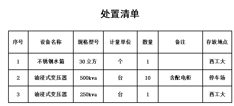 物品名称:报废水箱一间、变压器(含电箱)11组